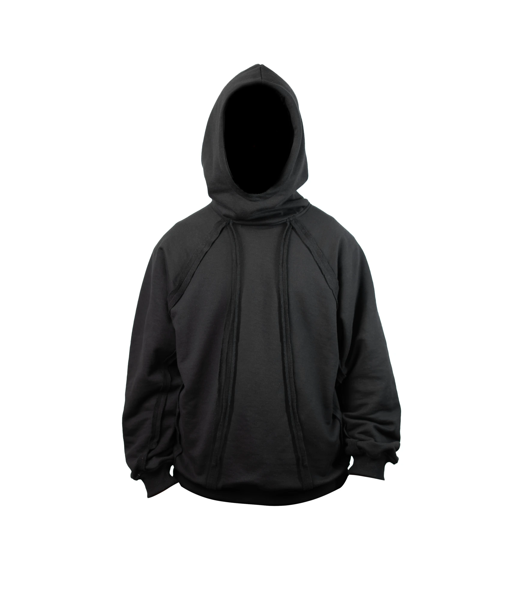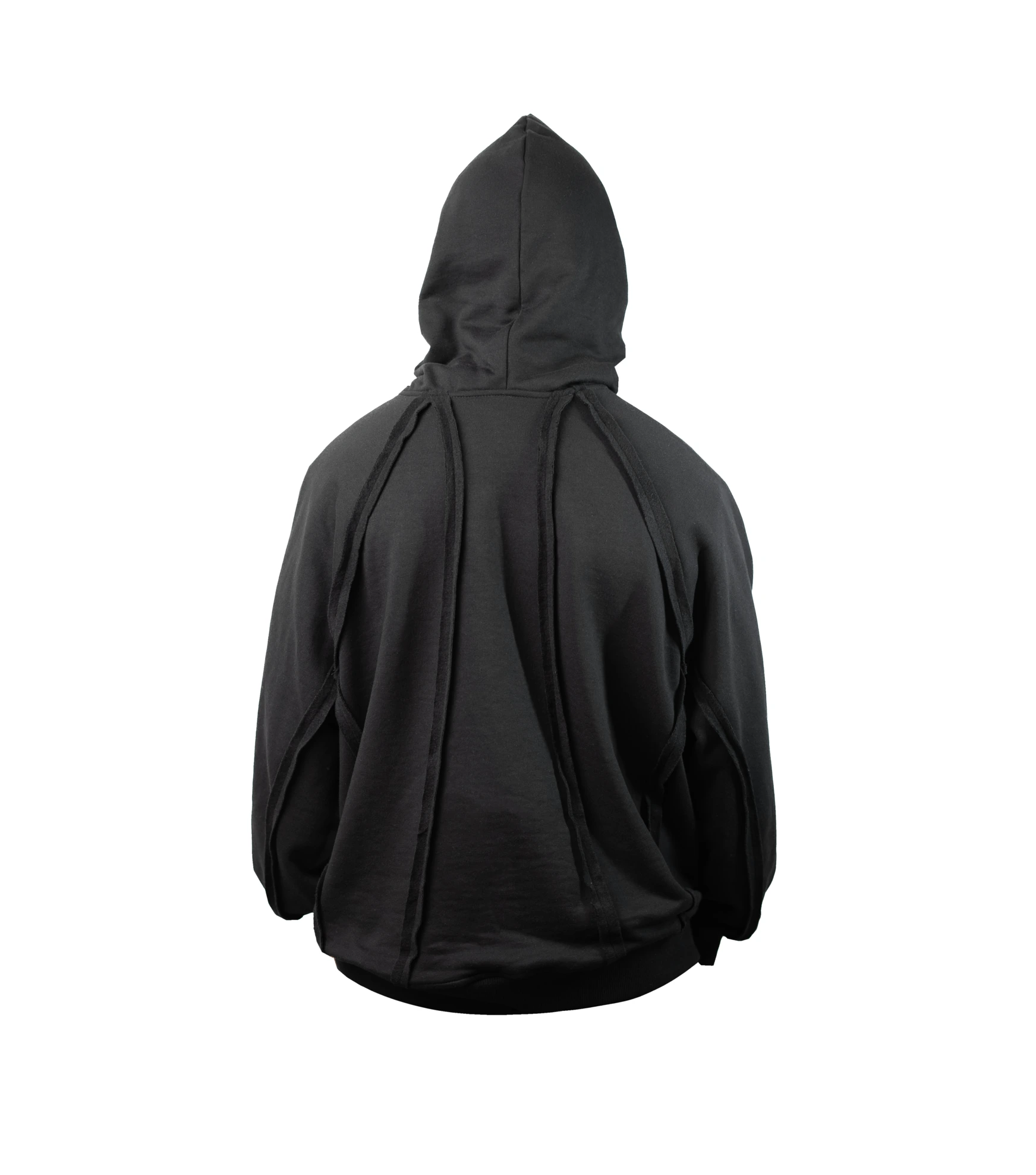 Sweat à capuche noir avec couture extérieure découpée à l’avant et à l’arrière aussi. et cagoule à capuche“ Fabriqué à partir de mélange de coton brossé intérieur “